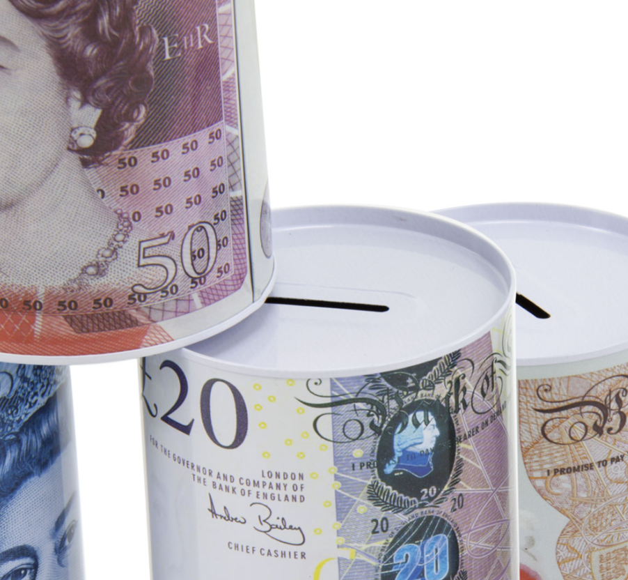 MTS75 Small Coin Money Tin Piggy Bank Savings Box 10 x 15cm Assorted Designs King / Queen 4839 (Parcel Rate)